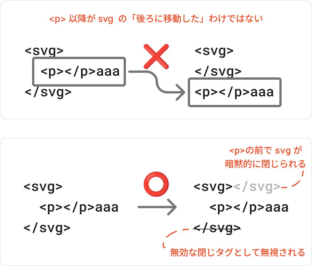 こうして、開始タグ <p> がなく閉じタグ </p> だけが <svg> 内にあるとき、「svg が p を子に持つ」という異常な DOM ツリーが構築されてしまったのである。